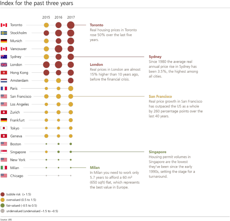 摘要:瑞银提醒,世界上有些城市的房价攀升速度已呈现出潜在的不可持续,有八座金融城市面临泡沫风险。排名第一的多伦多平均房价在13年间翻了一倍。香港已连续三年跻身前十。