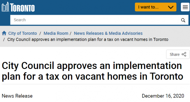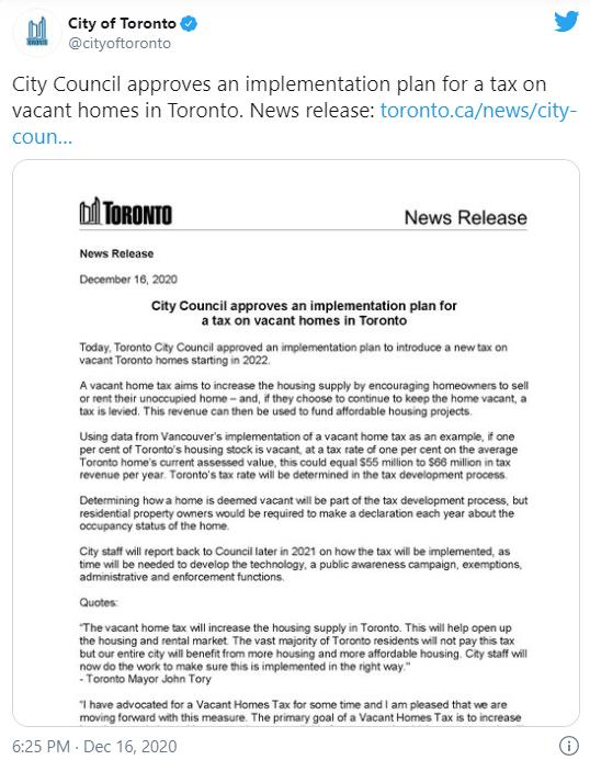 多伦多市议会于12月16日晚上,以24票赞成,1票反对决定在2022年开始实施房屋空置税。