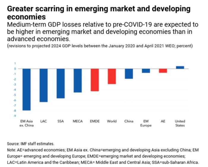 IMF总裁克里斯塔利娜·格奥尔基耶娃在IMF春季年会前表示,“实际上,我们看到的是一种 ‘多种速度并存’ 的复苏,其日益依赖于美国和中国这两大引擎的驱动。到2021年底,能实现GDP远超危机前水平的国家屈指可数,而美国和中国就是其中的两个。”