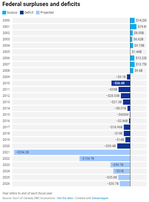 预算案题为“一项就业、增长和韧性的复苏计划”,显示联邦赤字在刚刚结束的财年达到3542亿元,到2021-22财年结束时将减少至1547亿元。