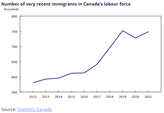 加入劳动力市场的新移民人数从2016年的612,000人激增至2019年的 751,000人。由于旅行限制和其他与疫情相关的措施,2020并未出现增长。
