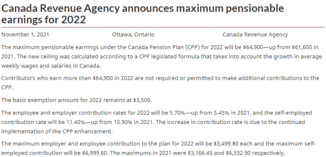 11月1日,加拿大税务局(CRA)宣布,收入上限,即年度最大可退休收入(YMPE),将从2021年的$61,600元升至2022年的$64,900元。涨幅为5.3%,是1992年以来的最大百分比变化。