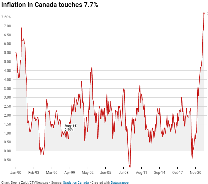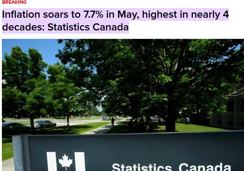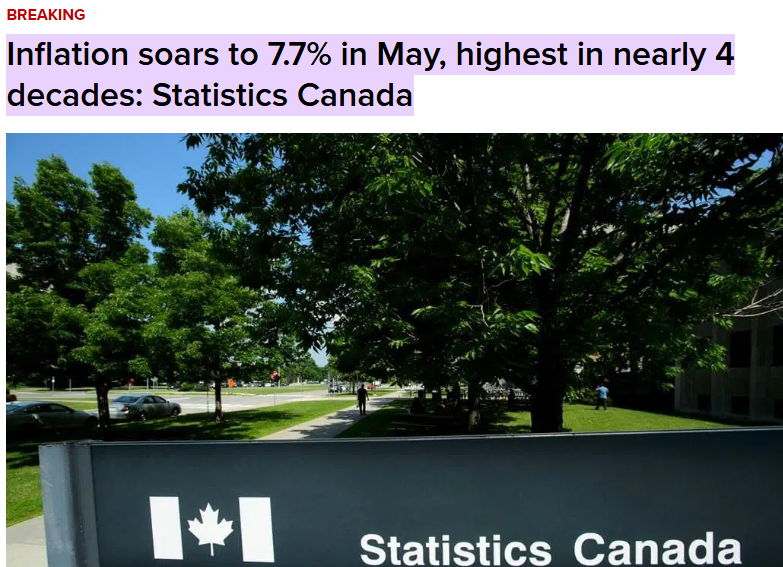 统计局表示,加拿大5月份消费者价格指数(CPI)同比上涨7.7%,为1983年1月以来的最大涨幅,当时该指数上涨8.2%。
