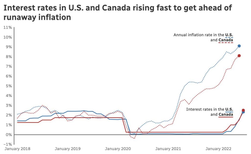 在大流行初期大幅降息后,世界各国央行最近都开始大举提高贷款利率,以应对已升至数十年来最高点的通胀。上个月,美国官方通胀率超过 9%,而加拿大目前超过 8%。