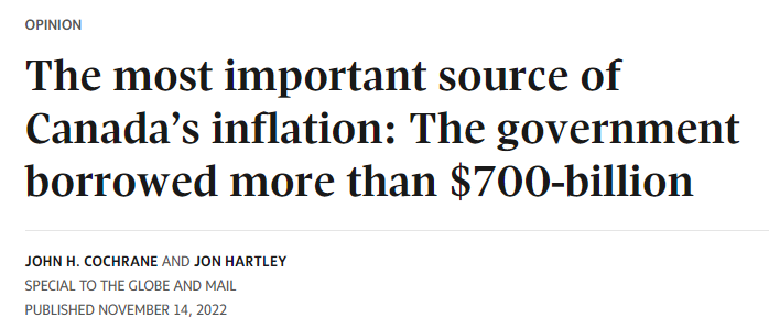 斯坦福大学胡佛研究所的高级研究员、《价格水平之财政理论》的作者约翰‧H‧科克伦(John H. Cochrane)在《环球邮报》刊文说,加拿大通胀最重要的来源很简单:从2020年开始,政府举债超过7,000亿元,而且大部分都发出去了。人们花掉了这些钱,推高了物价。