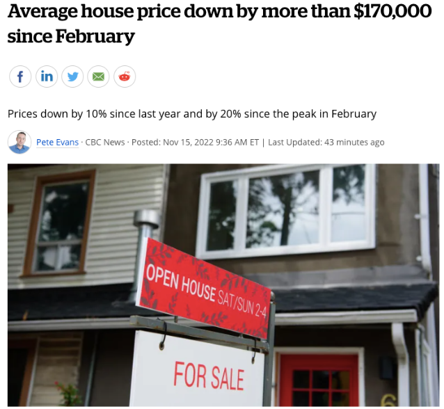 11月15日,加拿大房地产协会(CREA )在一份新闻稿中表示,10 月份全国房屋平均售价与去年同期相比下降了 9.9%,与今年 2 月的峰值相比,下降幅度更大,跌了20% 以上。另外,10月份房屋销售量方面,与去年同期相比下跌了三分之一以上。不过,10 月份的销售额比 9 月份增长了 1.3%,是自 2 月份以来的首次录得月度增长。