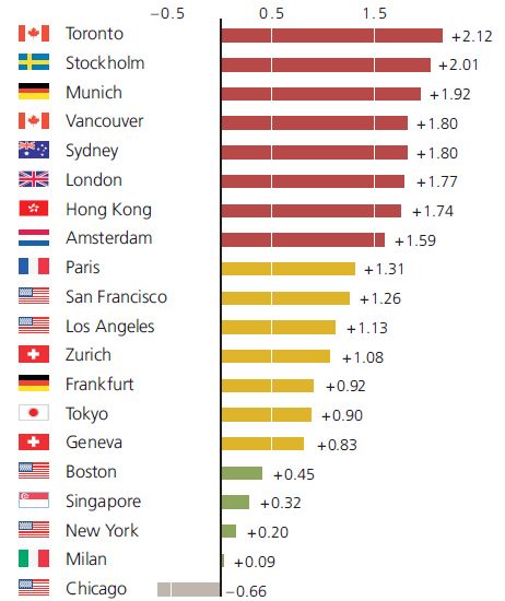 瑞银提醒,世界上有些城市的房价攀升速度已呈现出潜在的不可持续,有八座金融城市面临泡沫风险。排名第一的多伦多平均房价在13年间翻了一倍。香港已连续三年跻身前十。