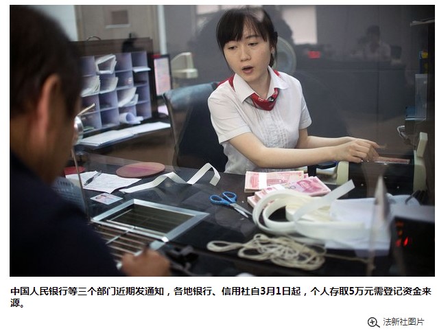 (简中) 中国人民银行等三个部门近期发出通知,各地银行、信用社自3月1日起,对个人账户存取人民币5万元以上现金或外币等值一万美元以上,需了解并登记资金来源。上述规定早在去年7月开始为期两年的“两省一市”作为试点,但八个月后提前实施。
