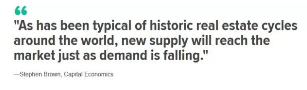 布朗在他的报告中指出,近年来加拿大各地,尤其是温哥华和多伦多地区,建了太多新屋。正如世界各地所出现的房地产周期那样,当新的供应大量增加而需求下降之时,市场价格就会下降。
