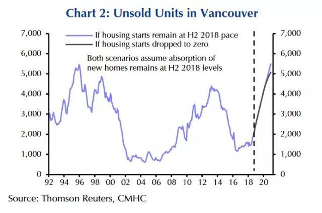布朗举出多伦多和温哥华的例子。在2018年,多伦多的房屋销量比历史平均要少15%,而温哥华更低于历史平均40%。当然这个问题在温哥华更显著,在未来两年,将有40,000套新屋建成投入市场,令温哥华房屋存量翻番。而在房子卖不出,卖不动的情况下,房价自然下跌。