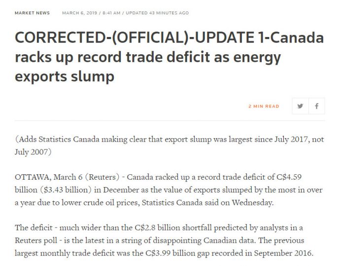 路透评论称,这是加拿大一系列令人失望的数据中最新的一项。对于加拿大单月出口额创下自2007年7月的暴跌4.5%以来最大的单月跌幅,路透认为,这是因为原油价格疲软及出货量下降导致的。